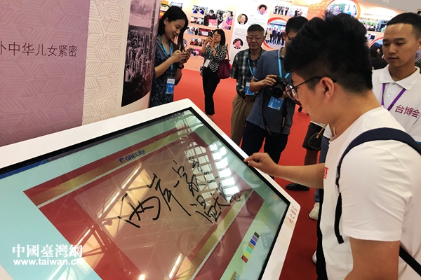 北京联合大学研究生温天鹏观展后留言“两岸一家亲”。(中国台湾网 赵苗青 摄)
