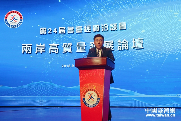 海峡两岸关系协会会长张志军在第24届鲁台经贸洽谈会开幕式上致辞。(中国台湾网 赵苗青 摄)