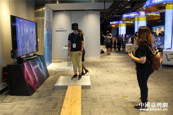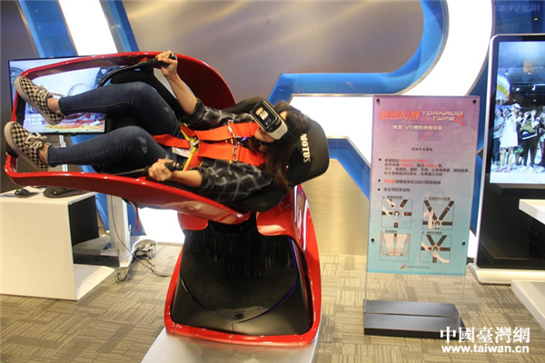 台湾同学体验VR游戏“急速风暴”。(中国台湾网 王莉婷 摄)