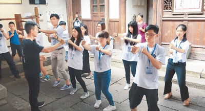 图为两岸青年在三坊七巷内的咏春文化展示中心学习咏春拳。