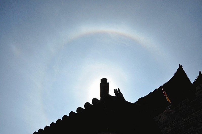 8月19日上午10时许,在代县雁门关上空出现了罕见的日晕现象。雄关边塞,蓝天白云,一圈完整的日晕如佛光乍现,又似一道色彩斑斓的环形彩圈将太阳包围,悬挂在雄关要塞之上,景象十分壮观。由于当日正值第三届中国·雁门关国际边塞文化旅游节开幕,前来景区的众多游客纷纷驻足观看了这一奇观,日晕持续一个多小时后渐渐淡去。