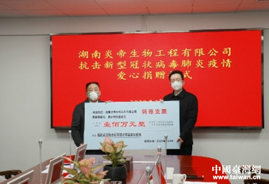 2月4日 湖南炎帝生物工程有限公司向株洲市慈善总会捐赠100万元 直接用于武汉防疫一线。 (中国台湾网 发)