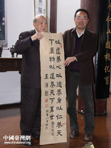捐赠仪式上,台湾老艺术家王萍老先生向贵州大学捐赠了一幅大横山水画、一幅对联和一幅清代古萱纸横幅。王萍老先生说:“我的家乡在贵州省大方县,背井离乡数十载,对家乡的思念常常难掩于面。这次捐赠的作品里有一横幅所用之纸有三百多年历史,仅我个人就保存了五十余载,我始终想着要把最好的献给自己的家乡。今天将它捐赠给贵校,终于了我心愿。”其余的台湾书画艺术家也纷纷将随行所带之墨宝赠予贵州大学。