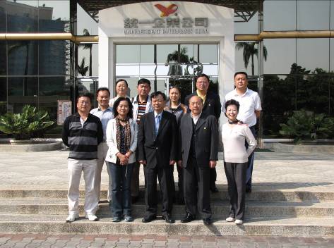 访问团与台湾统一企业集团公司总部的交流。11月20日,访问团在高雄市前往阿里山的途中,参观了统一企业集团公司总部。公司安排郭启瑞投资总监、姚明兴投资主办、苏姵榛投资主办热情接待。1967年7月1日,该公司成立,资本额3200万台币,员工82人。企业经营理念是“三好一公道”即产品品质好、信誉好、服务好、价格公道。生产矿泉水的标准高于国际标准,理念是:尊重生命、彼此关怀、乐观进取、亲近自然。曾有坏人用针管注射毒品进去,用以敲诈公司。董事长下令将该批次矿泉水全部销毁,员工曾痛心地提出自费购买也不行,公司损失2亿台币,但也赢得了良好的信誉。我们曾经考察过的集团下属梦时代购物广场,是台湾和东南亚地区最大的购物中心。2007年,集团营业额105亿美元,员工数达7万人。公司徽标由一只向西飞翔的鸟(象征企业理念中的“一公道”)、三个英文字母”p”变形(象征企业理念中的“三好”)和英文字母Uni-presidnt(象征企业走向国际)组成。特别难能可贵的是,那只鸟向西飞,东、南、西、北该可飞,为什么要向西飞呢?因为西边是中国大陆!公司成立时生产的第一包统一方便面,40多年过去了(虽然已有部分变成粉末),至今还陈列于公司产品橱窗里,她见证了统一企业的辉煌。“统一”商标的价值更是难以估量。