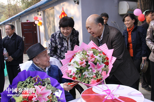 中国台湾网11月2日贵阳消息  10月31日下午,贵阳墨石山庄养老院张灯结彩,摆起丰盛的长桌宴,为居住在养老院的台胞杨占鳌先生庆贺百岁寿辰。贵州省台办联络处处长成高荣,贵阳市委统战部副部长、市台办主任李静,副主任刘筑琪,白云区副区长李芸及区台办、民政局、都拉乡等当地相关部门负责人均前往祝贺。