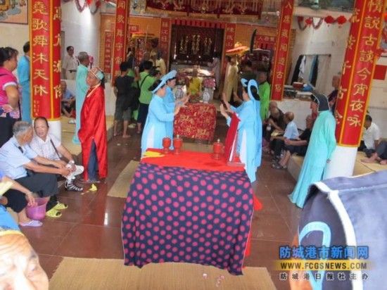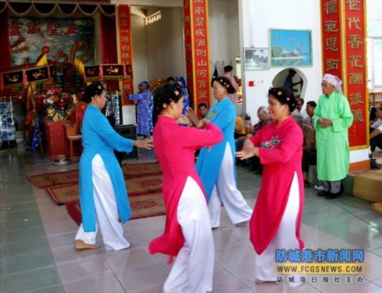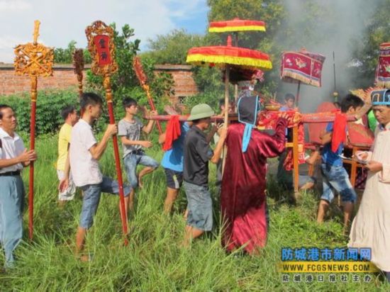 哈节除了歌舞娱乐外,还依顺序举行“迎神”、“祭神”、“送神”等仪式。“迎神”的人们打着罗伞,抬着神案,于鼓乐声中到大海边把“镇海大王”等灵神迎接回哈亭正殿就座,然后由德高望重的人主持,率众人以“三牲五礼”敬献于诸神及历代先祖面前,祈求他们保护全村平安,各户兴旺。直到哈节结束,才再次打伞抬案,一路香烛相伴,把诸神送归天界。京族人的宗教观念大都与海有关,寄托着他们对大海的敬畏及追求。(卢欣)