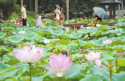 今夏,青秀山上比往年更为“热闹”,因为青秀山风景区新引进的300多个水生花卉品种终于与游客见面了。这些不同的花色品种,经过风景区工作人员独具匠心的设计和布置,与青秀山原有的自然景观交相辉映,相得益彰,让游客看得非常过瘾。
