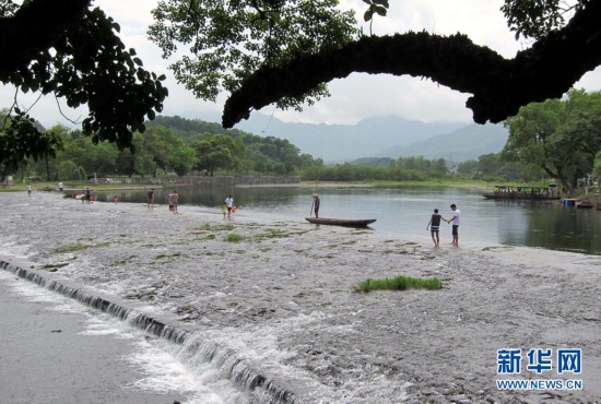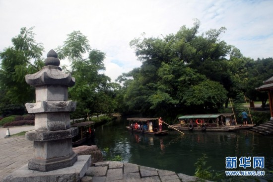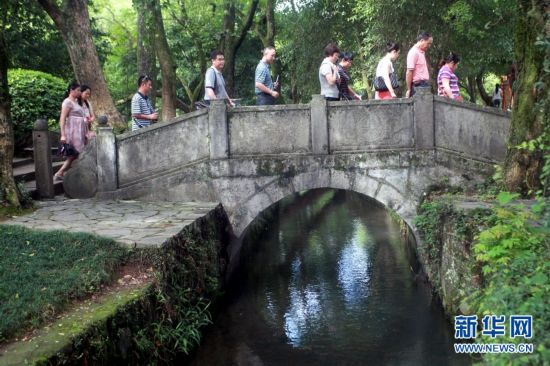 7月28日,游客从广西桂林兴安县千年古灵渠旁的“状元桥”上走过。广西桂林境内的灵渠距今已有2200多年历史,是现存世界上最完整的古代水利工程和最古老的运河之一,至今仍然发挥着灌溉作用。在当地政府的有效地保护下,如今的古灵渠生态优良,风景如画,吸引各地游客慕名前来观光旅游。 (王滋创 摄)