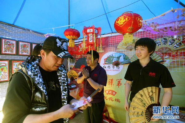 2月22日,高雄市民在高雄港香蕉码头选购红桥市场桃花坞的工艺扇。近日,台湾高雄港香蕉码头举办“北京特色周”活动,共有北京便宜坊烤鸭、东来顺涮羊肉、珐琅厂等33个知名小吃、手工艺品牌参加,活动将持续至2月26日。新华社记者 邢广利 摄