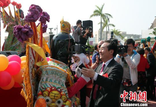 2月23日,台湾——北京特色周今天下午在高雄港香蕉码头举行。图为电音三太子与北京前来的嘉宾热情互动致意。陈立宇 摄