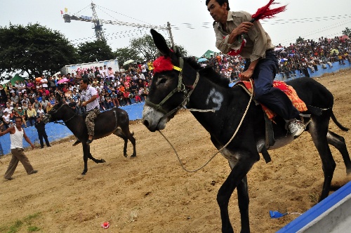 8月18日,参赛选手在那达慕大会上的赛驴比赛中。 当日,辽宁省阜新市阜新蒙古族自治县举行蒙古贞敖包文化旅游节。那达慕大会是本次旅游节的重要活动之一,其中赛马、摔跤、拔河等民族特色体育项目比赛吸引了大量游客观看。新华社发(杜欣梦 摄)