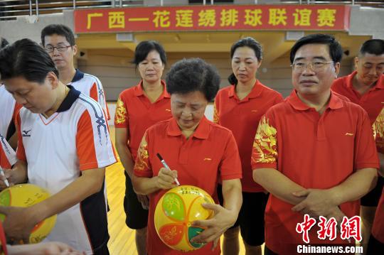 广西壮族自治区政协主席陈际瓦和花莲县县长傅崐萁分别率队参赛。赛前,陈际瓦(中)和傅崐萁(左)在排球上写下:“桂花永飘香,两岸一家亲”。 孙洁 摄