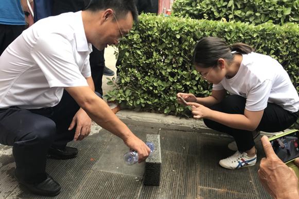 走进裴寨社区,正下着小雨,前来参观学习的团体络绎不绝。初见裴春亮,他在自己的家门前推销着村里自产的海绵砖。裴春亮一边演示还一边说道:"你们看一眼,我就拿水管弄了一下,直接就能渗下去,我们这里有原材料,能把村里的资源都用起来。"