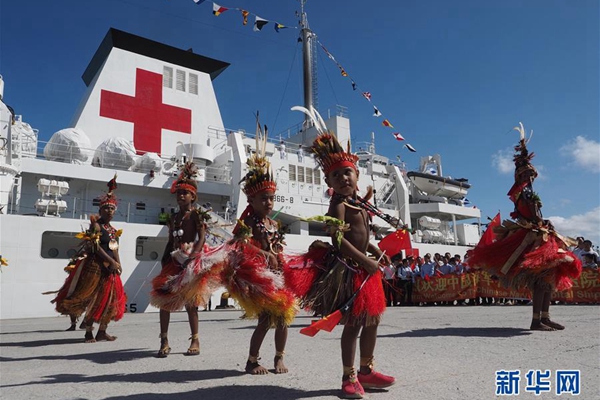 7月11日,在巴布亚新几内亚首都莫尔兹比港,当地民众跳起传统舞蹈,欢迎中国海军和平方舟医院船。执行“和谐使命-2018”任务的中国海军和平方舟医院船11日驶抵莫尔兹比港,开始对巴新进行为期8天的友好访问并提供人道主义医疗服务。(江山 摄)