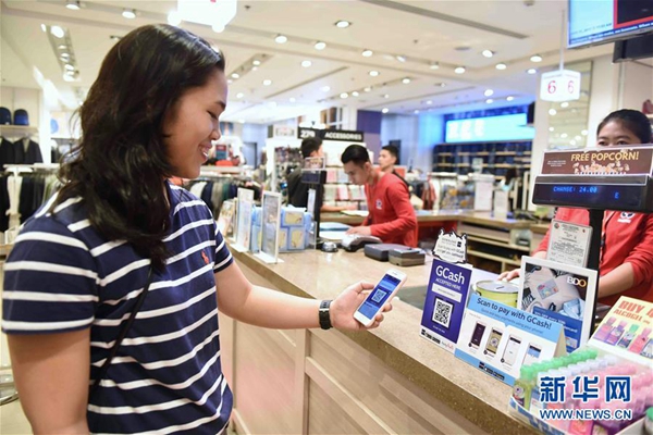 2017年11月11日,在菲律宾马尼拉一家商场,消费者使用GCash电子支付系统付款。与阿里巴巴合作的GCash被称作“菲律宾版支付宝”。记者 秦晴 摄
