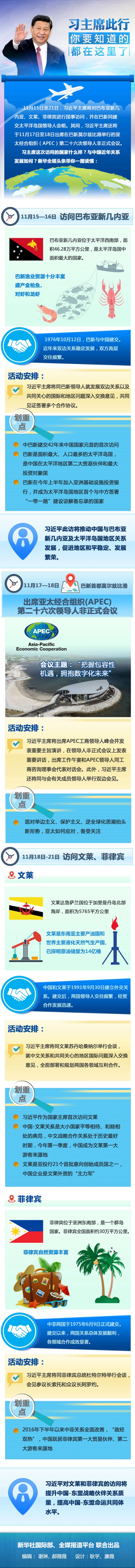 11月15日至21日,习近平主席将对巴布亚新几内亚、文莱、菲律宾进行国事访问,并在巴新同建交太平洋岛国领导人会晤。其间,习近平主席将于11月17日至18日出席在巴新莫尔兹比港举行的亚太经合组织(APEC)第二十六次领导人非正式会议。