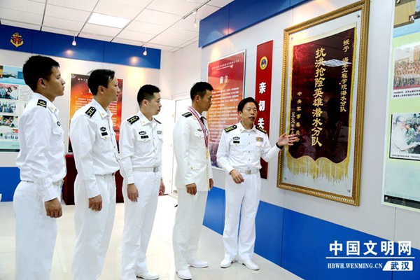 官东和战友们一起参观抗洪抢险英雄展馆。图片来源:武汉文明网