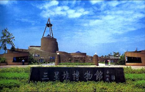 三星堆因三座突兀在成都平原上的黄土堆而得名。三星堆遗址发掘出大量古蜀国各种工具和器物,在世界考古学界引起了轰动。三星堆遗址为中国西南地区的青铜时代遗址。1929年春,当地农民燕道诚在宅旁挖水沟时,发现了一坑精美的玉器,由此拉开三星堆文明的研究序幕。1980年起进行系统发掘,在遗址中发现城址1座,据认为,其建造年代至迟为商代早期。已知东城墙长1100米,南墙180米,西墙600米,为人工夯筑而成。清理出房屋基址、灰坑、墓葬、祭祀坑等。房基有圆形、方形、长方形3种,多为地面木构建筑。自1931年以后在这里曾多次发现祭祀坑,坑内大多埋放玉石器和青铜器。1986年发现的两座大型祭祀坑,年代约当商末周初,被认为是蜀人祭祀天地山川诸自然神祗的遗迹,出土有大量青铜器、玉石器、象牙、贝、陶器和金器等。金器中的金杖和金面罩制作精美。青铜器除罍、尊、盘、戈外,还有大小人头像、立人像、爬龙柱形器和铜鸟、铜鹿等。其中,青铜人头像形象夸张,极富地方特色;立人像连座高2.62米,大眼直鼻,方颐大耳,戴冠,穿左衽长袍,佩脚镯,是难得的研究蜀人体质与服饰的资料。