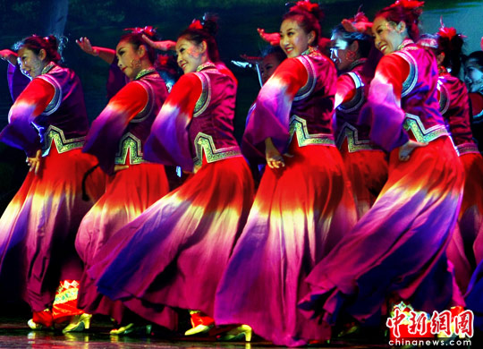 6月17日,内蒙古莫旗乌兰牧骑歌舞团在台北举行《神奇达斡尔》演出记者会,彩排群舞《清水河边的歌声》、鸟春说唱《我的猎鹰》、《达斡尔曲棍球》等节目。中新社发 宋吉河 摄
