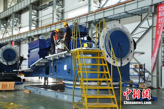 中科风电车间内,工作人员正在进行部件组装。邓永胜 摄