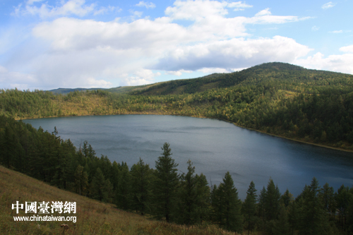 阿尔山天池位于阿尔山东北74公里天池岭上,海拔1332.3米,有484级台阶。如果从天空俯视天池,天池像一滴水滴。按海拔高度,阿尔山天池在天山天池、长白山天池之后,居全国第三。(中国台湾网 陈宁 摄)