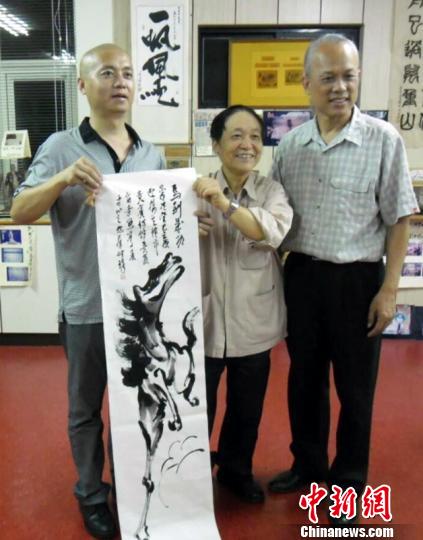 图为台湾画家秦仲璋(中)向何秉华致赠“马到成功”的画作。陈立宇 摄