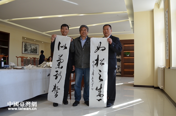 赠送书法作品。(图片来源:滨海新区台办)