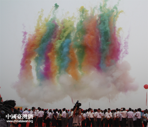 启动仪式结束后,未散尽的彩色烟雾犹如祥云般升腾在会场上空。(中国台湾网 张蕾 摄影)