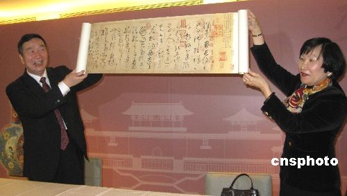 3月2日下午,台北故宫博物院与北京故宫博物院代表在台北故宫博物院,就2月15日双方在北京达成的共识举行进一步会谈,并在会后召开记者会,发表落实合作交流方案,双方同意在不涉及名称载示及法令之前提下,进行8项实质性合作。图为北京故宫博物院院长郑欣淼(左)和台北故宫博物院院长周功鑫(右)在展示台北故宫赠给北京故宫的唐代怀素《自叙帖》的高仿复制品。 中新社发 路梅 摄