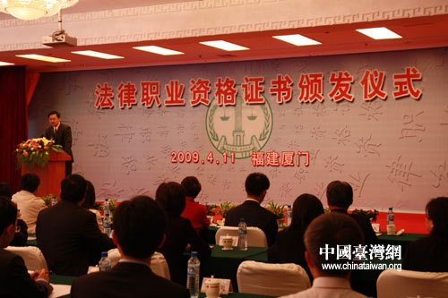 中国台湾网4月12日厦门消息 昨天下午,司法部国家司法考试办公室为首批通过国家司法考试,获得法律职业资格的台湾居民颁发了《法律职业资格证书》。获颁证书的台湾居民纷纷表示,国家司法考试向台湾居民打开大门,为海峡两岸的法律交流与沟通架起了一座新平台。