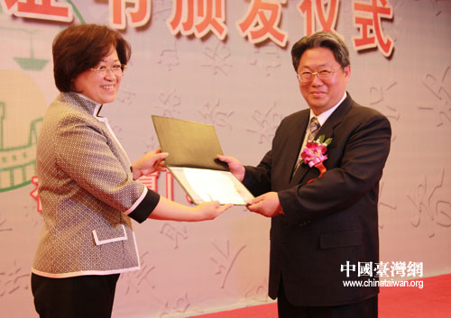 国家司法考试司司长丁露为获得律师职业资格的台湾居民颁发资格证书。(中国台湾网 张弛 摄)