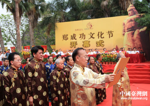 5月17日,来自海峡两岸的民众在厦门思明区鼓浪屿举行盛大颂典,共祭民族英雄郑成功。由此,正式拉开了“郑成功文化节”的大幕。图为主祭人念祭文。(中国台湾网 邵磌 摄)