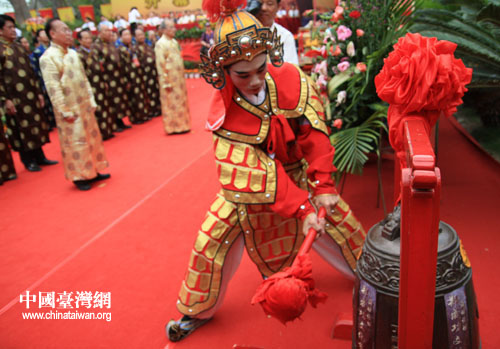 “鼓初严、再严、三严”,在大陆主祭人郑家麟和台湾主祭人、奉祀郑成功联合会理事长简庆雄的率领下,两岸52位陪祭、同祭人行礼如仪。国家文化部副部长赵少华、博鳌亚洲论坛秘书长龙永图等,以及来自两岸的数百位民众亦全体肃立,向民族英雄致敬。