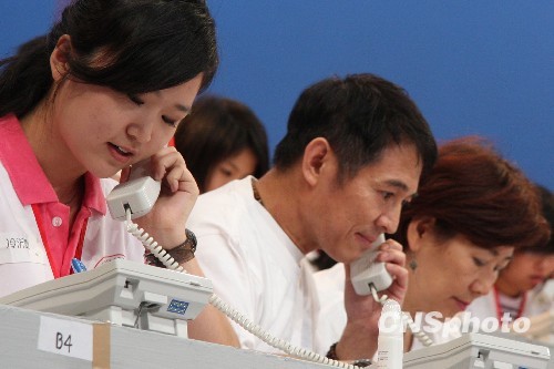 8月14日晚,武打功夫片巨星李连杰(中)现身中视、中天举办的“88赈灾募款晚会”,并向“莫拉克”台风中受创的台湾民众捐款。 中新社发 董会峰 摄