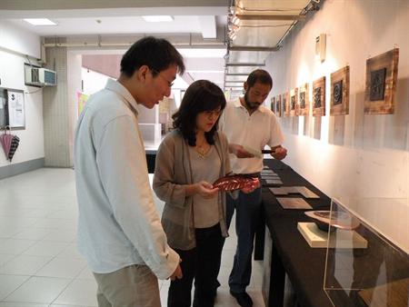 你好台湾网9月7日消息 在台湾树德科大停留二周的大陆驻校艺术家冯建平与张志纲,昨日在生活产品设计系主任杨彩玲的工作团队规划下,分别发表个人擅长的金工与漆艺作品观摩交流,同时也与系上师生及业界人士展开一场“两岸金工与漆艺交流”的对话研讨。