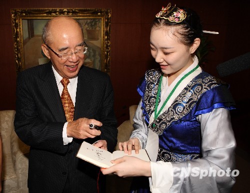 中国国民党主席吴伯雄9月23日在台北会见了以国家民委副主任杨健强为总顾问的大陆少数民族大学生文化交流团一行。吴伯雄在会见中对此次文化交流团的民族歌舞演出表示非常期待。他说,此次演出的收入将捐给台湾灾区,这令人感佩。大陆少数民族大学生文化交流团在为期两周的时间里将在台北、台中和金门等地进行多场慈善演出,并和台湾六所大中学校的学生进行交流。 中新社发 杨博 摄