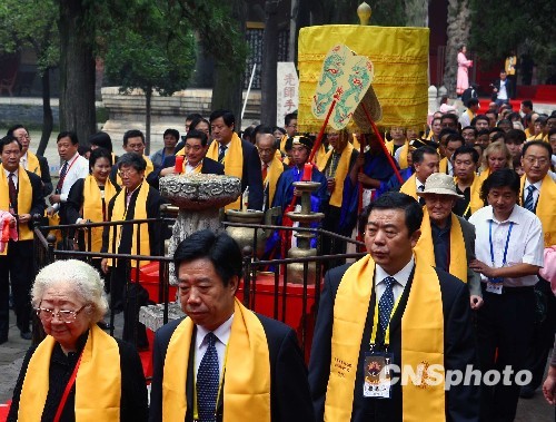 据台湾《中国时报》报道,昨日上午,《孔子世家谱》续修告成颁谱仪式开始,来自世界各地的孔子后裔代表、政府官员及学者专家等共同参与。揭谱后,孔子第七十七代孙孔德墉还将整套《孔子世家谱》增送给两岸图书馆、曲阜市人民政府。