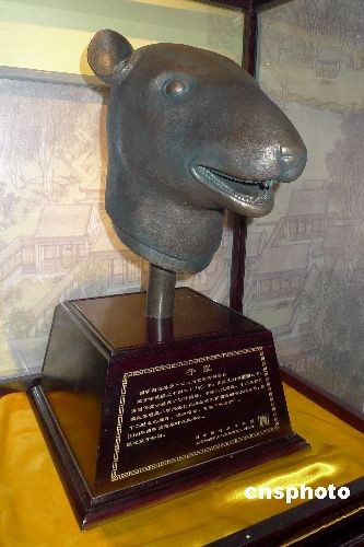 资料图片:4月30日,北京圆明园海晏堂十二生肖齐聚展正在圆明园遗址公园展出,图为鼠首仿制品。 中新社发 冯军(北京) 摄