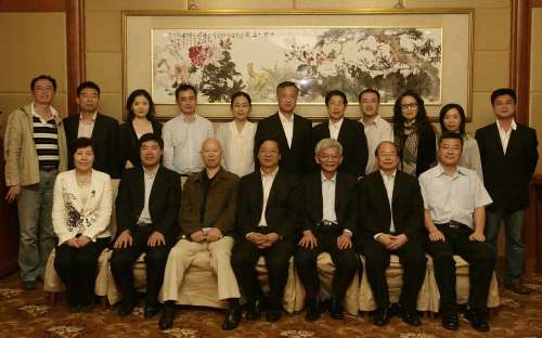 在欢送晚宴上,国民党文传会主委李建荣(前右二),民进党顾问许信良(前左三),旺报社长兼总编辑黄清龙(前右三),与参访团团长、香港文汇报董事长兼社长王树成(前右四),副团长、大公报总编辑贾西平(前右一)及参访团成员合影留念。图片来源:大公报