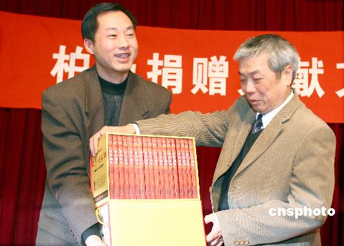 资料图:2007年2月6日,“柏杨捐赠文献文物入藏新闻发布会”在北京中国现代文学馆举行,中国现代文学馆馆长陈建功(右)代表文学馆现场接受了捐赠的《柏杨版资治通鉴》。 中新社发 廖文静 摄