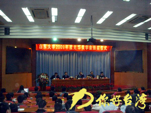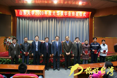 你好台湾网11月30日消息 11月9日下午,山东大学2009年度光华奖学金颁奖仪式在中心校区邵逸夫科学馆一层报告厅隆重举行。台湾光华教育基金会代表曾达梦先生,山东大学党委副书记方宏建、校港澳台事务办公室主任佟光武,校党委研究生工作部部长桑晓旻出席颁奖仪式,校党委学生工作部部长曲明军主持仪式。