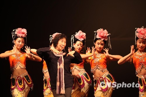 西北民族大学舞蹈学院教授、国家一级编导高金荣率该学院师生来台献艺,将与台湾敦煌能量艺术研究会的业余舞蹈演员共同演出《妙音反弹》、《彩虹》、《大飞天》、《千手观音》等舞作。图为十二月九日举行的记者会上,高金荣(左二)指导师生表演。中新社发 曾嘉 摄
