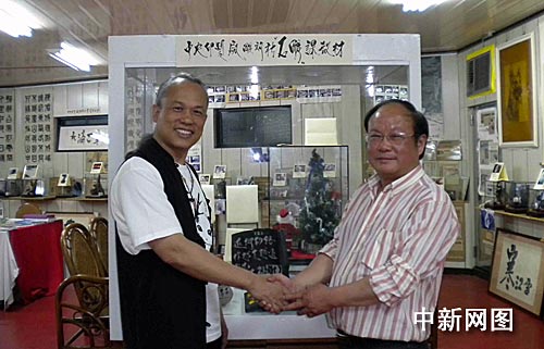 杭州萧山天石微雕馆馆长冯耀忠(右)近日访问台湾,与台湾著名微雕家陈逢显(在)在陈逢显毫芒雕刻馆合影交流。陈文 摄