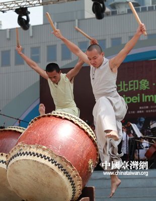 16日上午,台湾著名演出团体优人神鼓在上海世博园内演出。当天,“台北印象·文化飨宴”演出活动在上海世博园城市广场举行。(中国台湾网 田云鹏 摄)