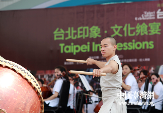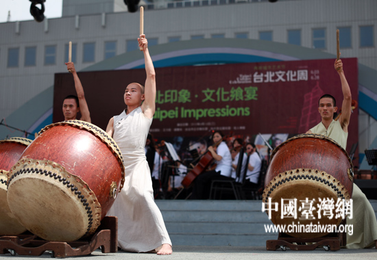 中国台湾网6月16日上海消息 16日上午,台湾著名演出团体优人神鼓在上海世博园内演出。当天,“台北印象·文化飨宴”演出活动在上海世博园城市广场举行。(中国台湾网 田云鹏 摄)