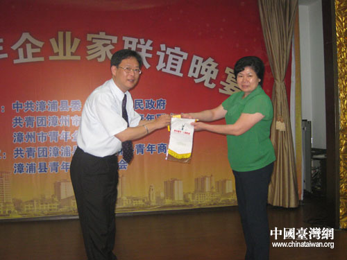 台湾青年创业协会十杰基金会向漳浦县副县长王彩云(右)赠送“青年动手 人类希望”的图标。(漳浦县台办 陈文亮 摄)