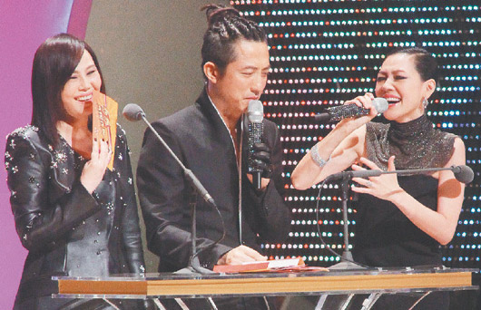 金曲奖主持人庾澄庆(中)、小S(右)与闽南语天后江蕙(左)颁发最佳年度歌曲。图片来源:台湾《联合报》