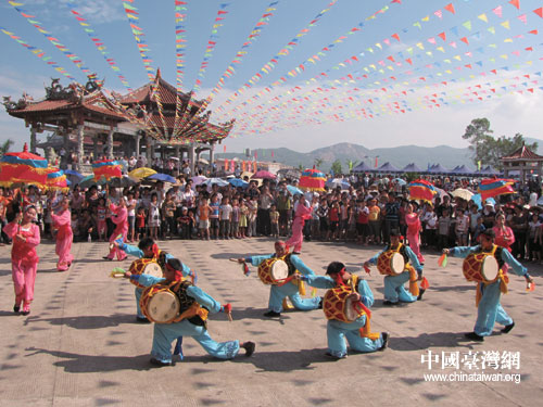 漳浦特色民俗文化“大车鼓”在雨霁顶三界公庙进行热情表演。(漳浦县台办 陈文亮 摄)