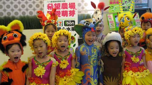 (记者吴亚明、徐蕾)在台湾“8·8”风灾周年之际,来自北京的蓝天儿童艺术团今天在这里举行了灾区果树认养活动。在台北统一超商大楼的“7—11”ibon便利生活站,孩子们穿着可爱的七彩戏服,边品尝台湾的各式水果,边用童言童语推广介绍,鼓励大朋友、小朋友一同加入爱心认养队伍,希望把爱传递到“8·8”灾区。
