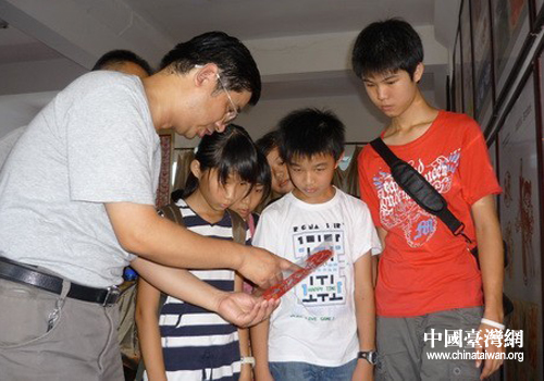 中国台湾网7月29日孝感消息 日前,来自台湾的五名小朋友到湖北孝感市雕花剪纸研究所参观雕花剪纸工艺。台湾小朋友们兴致勃勃的参观了剪纸工艺品展览,对中华民间艺术的博大精深无比赞叹。